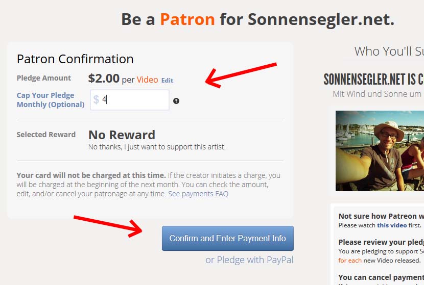 Nochmals überprüfen, bestätigen und Zahlungseinstellungen festlegen. Quelle: www.patreon.com